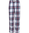 - Woven tartan trousers.