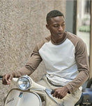 - Contrast collar and raglan sleeves.